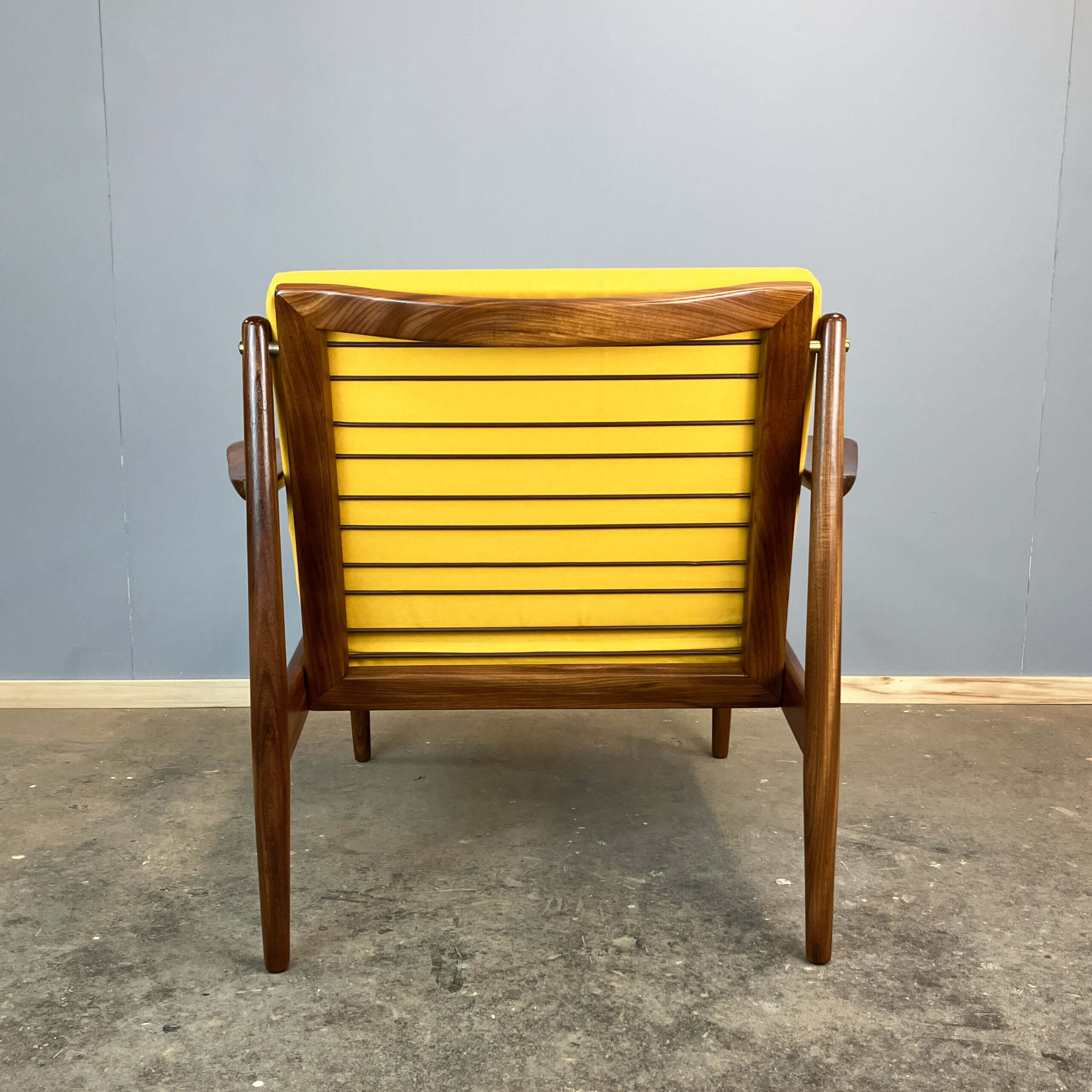 This is crafted from solid teak, has been fully sanded and finished with a glossy varnish. The spiral wire loops on the seat have been replaced, whilst the visible loops in the backrest are original. The new foam cushions have been upholstered in a coarse-woven cotton fabric.