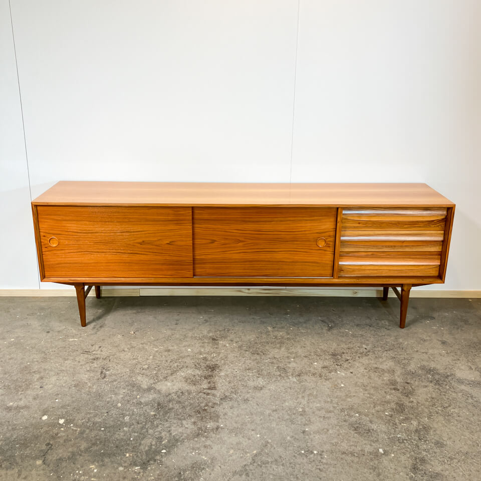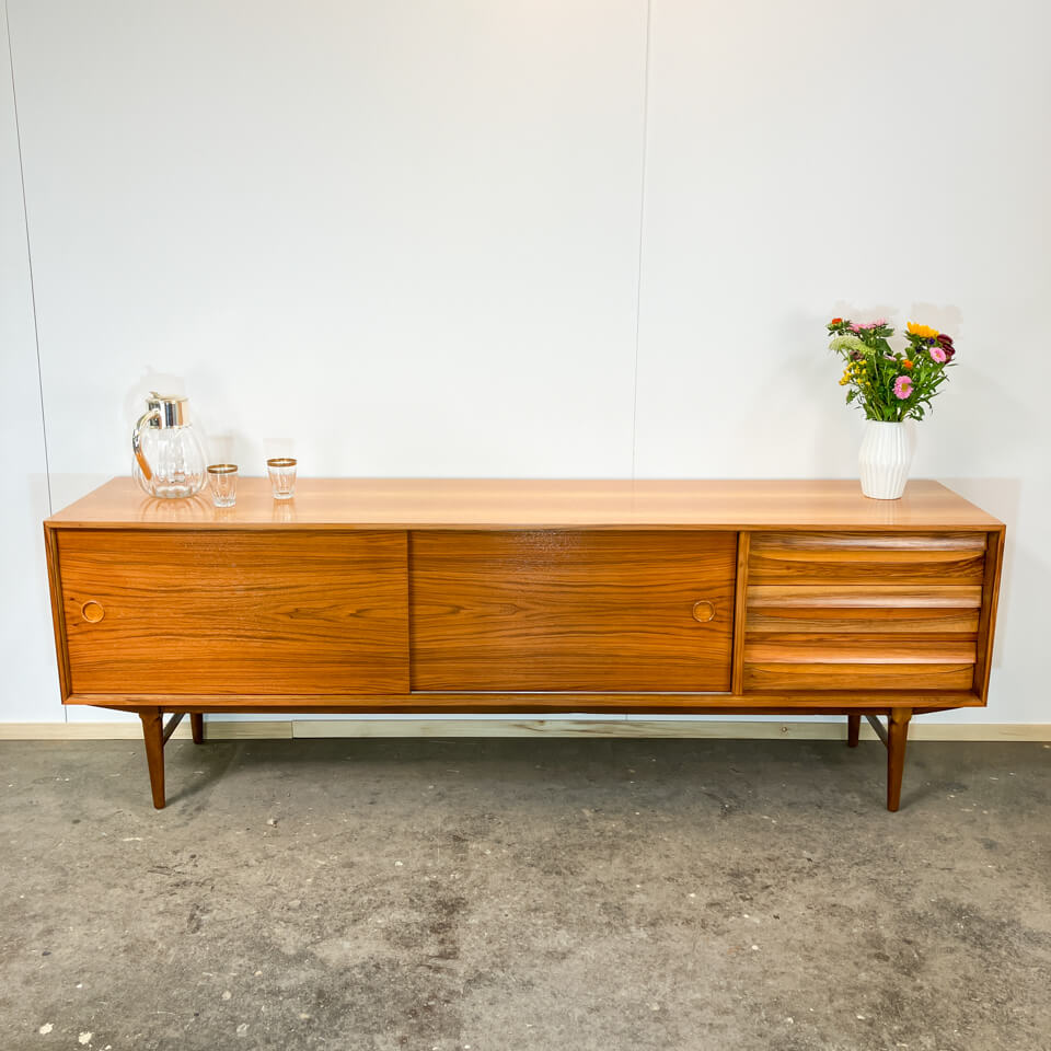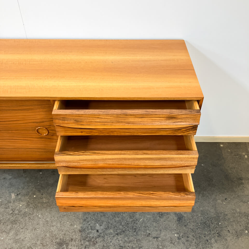 Exceptional sideboard from the Platon series by Lothar Wegner. It has a very high-quality finish and is characterised by its simple, elegant design with beautiful details such as the drawer and door handles. The exterior and interior surfaces are made of walnut veneer with solid wood edges, while the drawers and frame are also solid. The sideboard has been sanded and given a glossy lacquer finish.