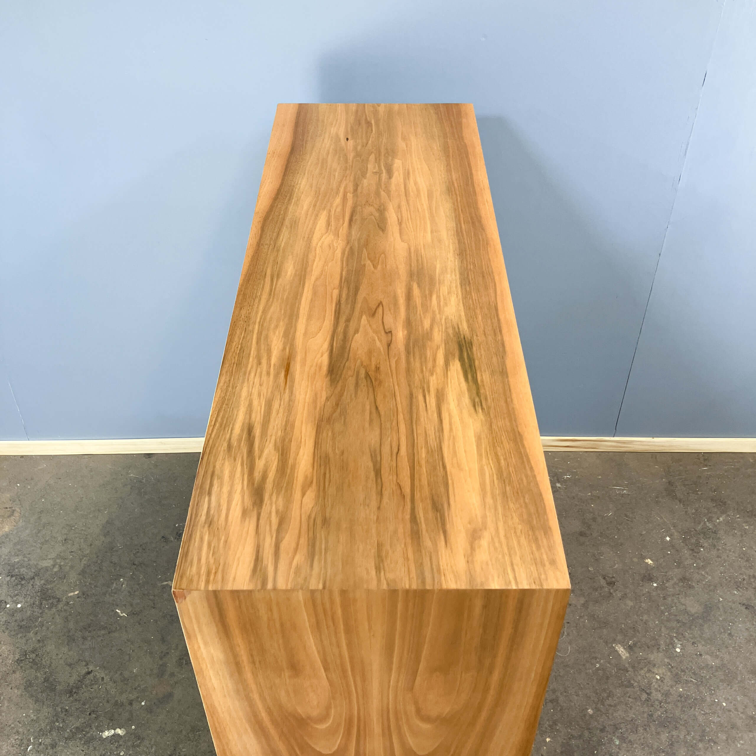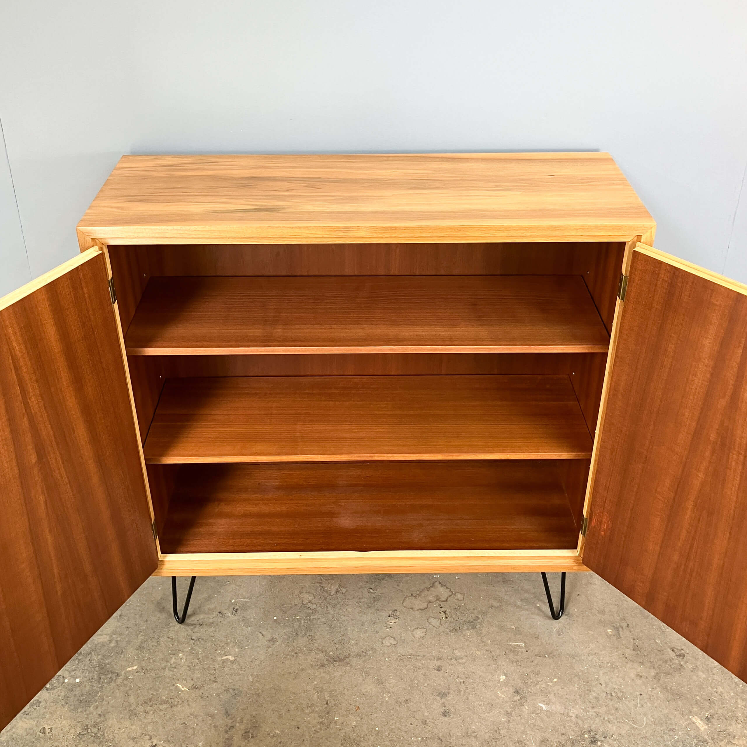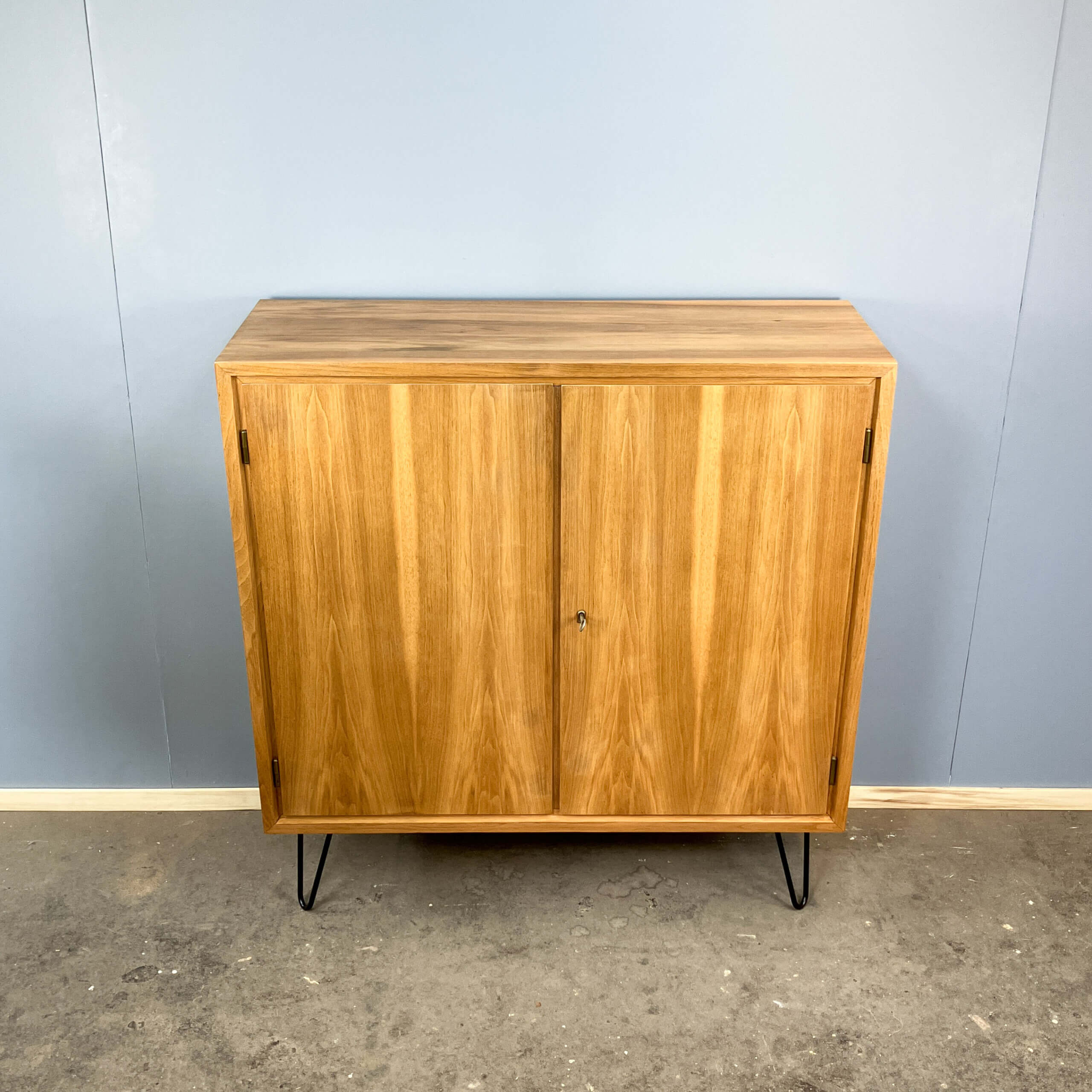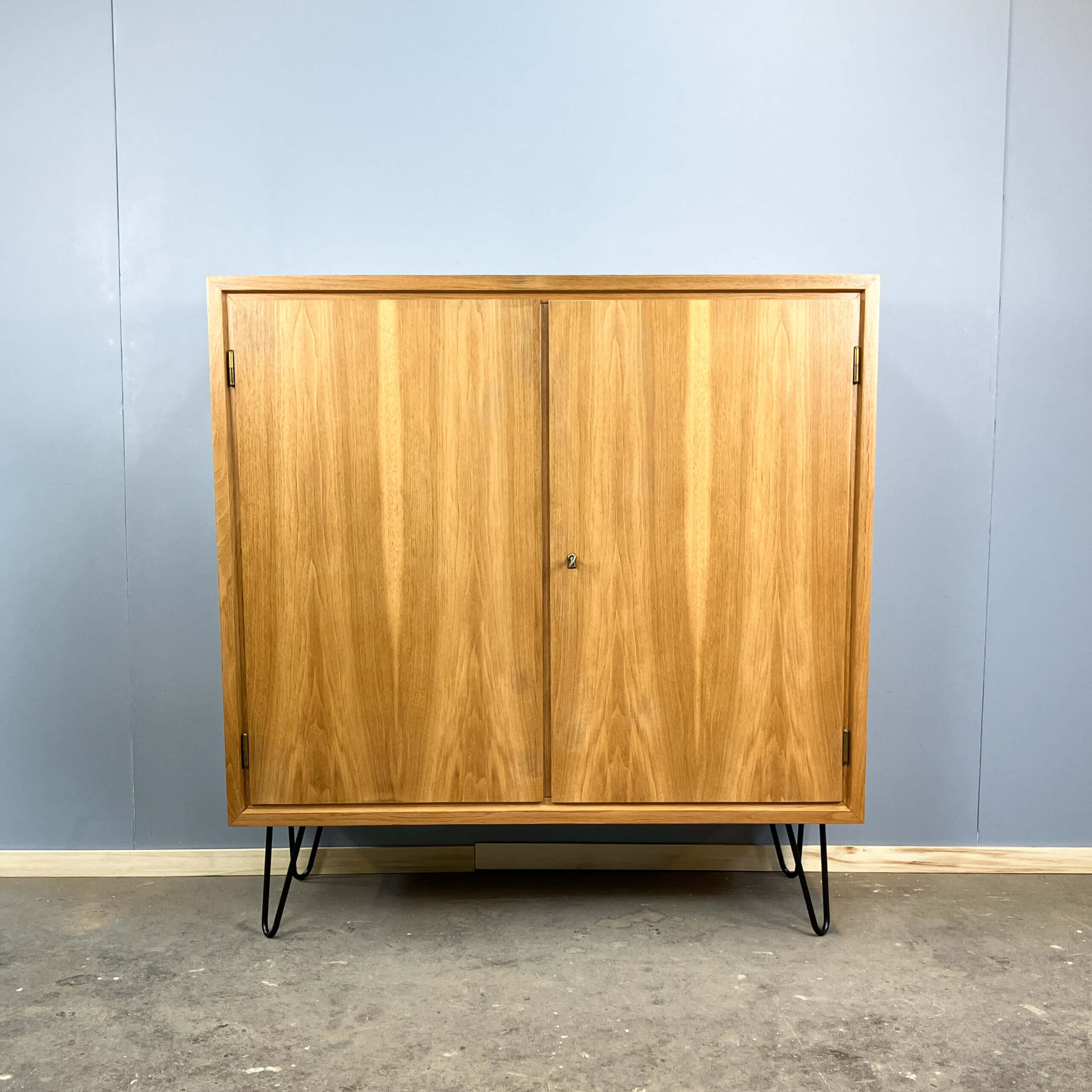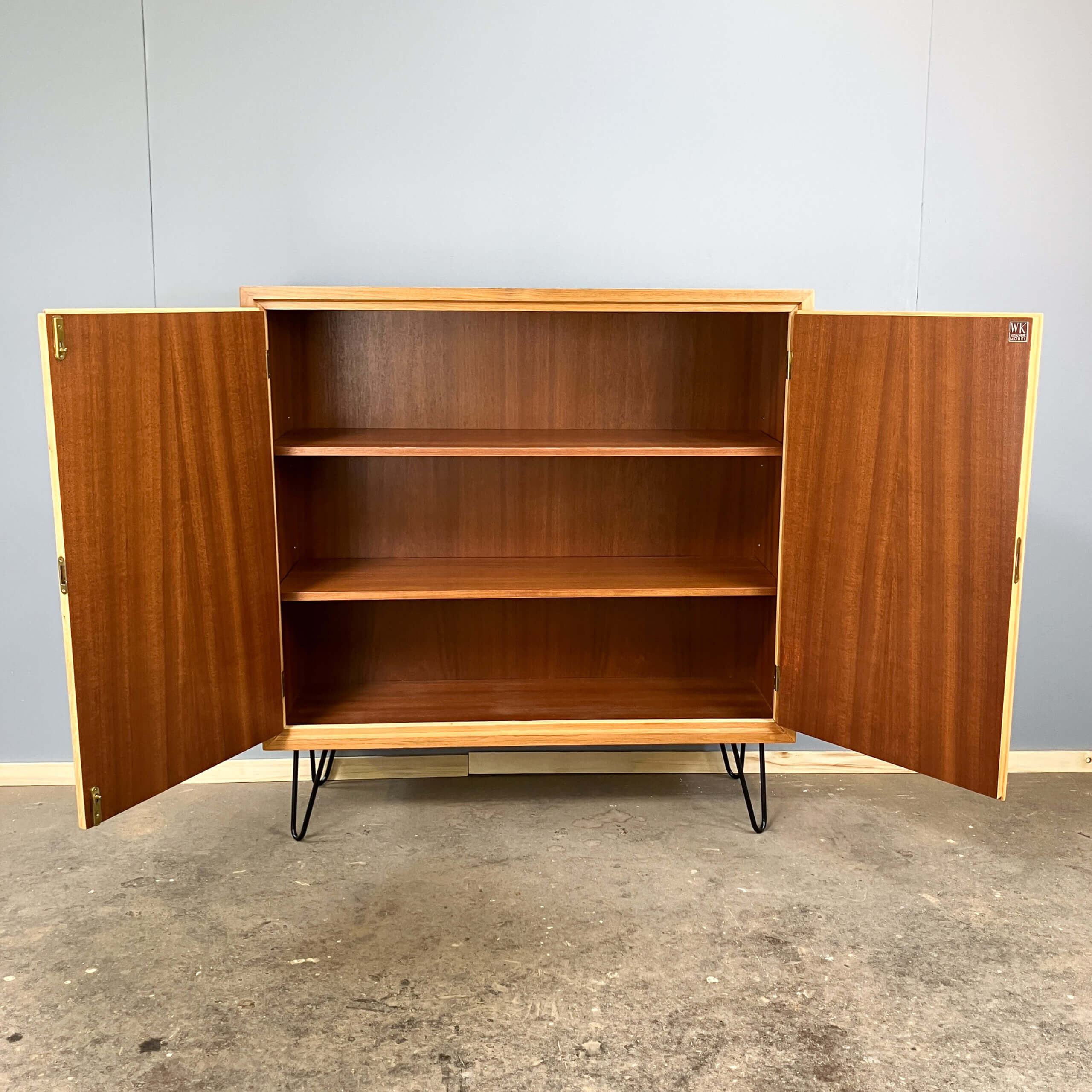The body is made of veneered blockboard with real wood edges, whilst the doors are made of veneered chipboard. The hairpin legs have been refitted and can be fitted with the plastic caps shown in the picture to protect the floor.