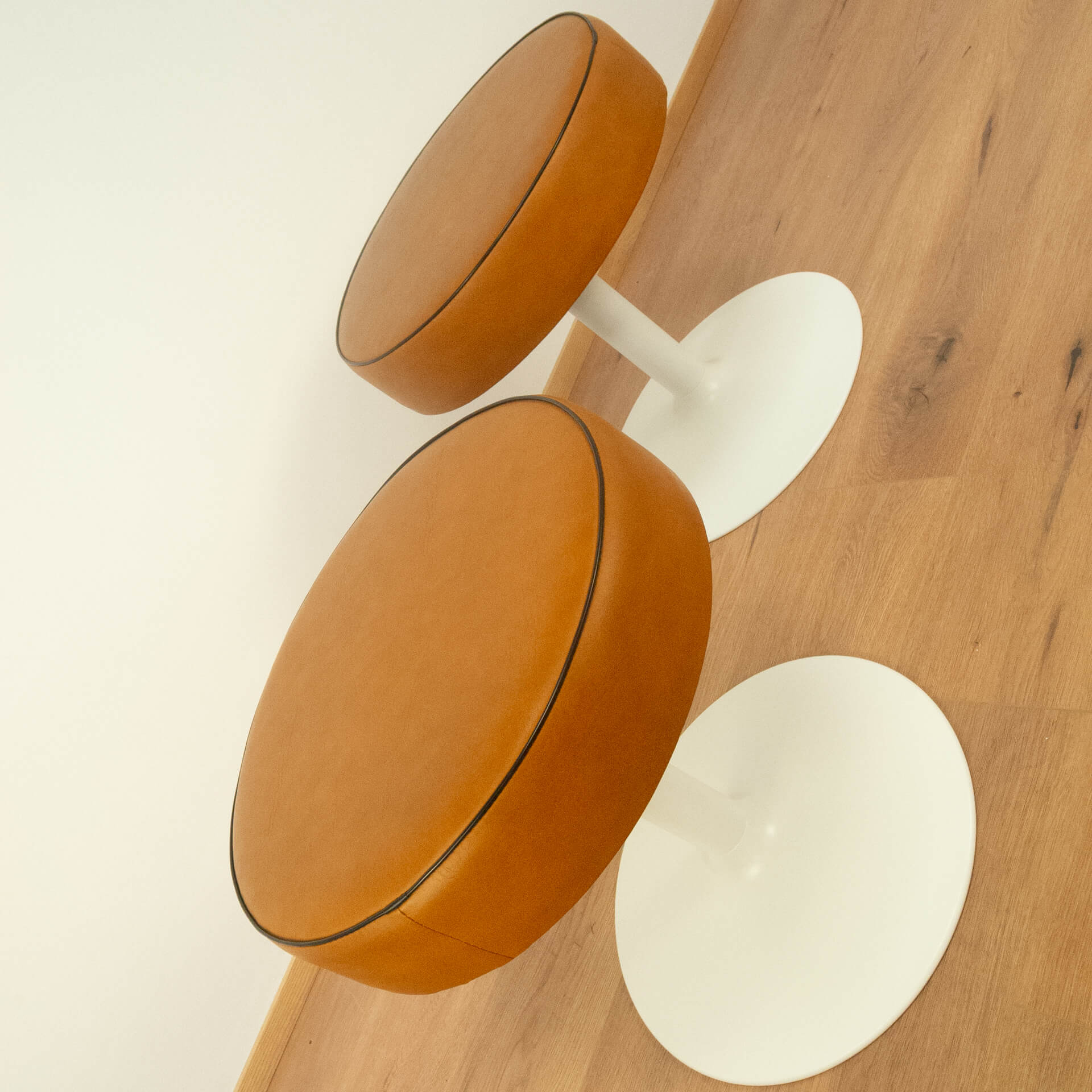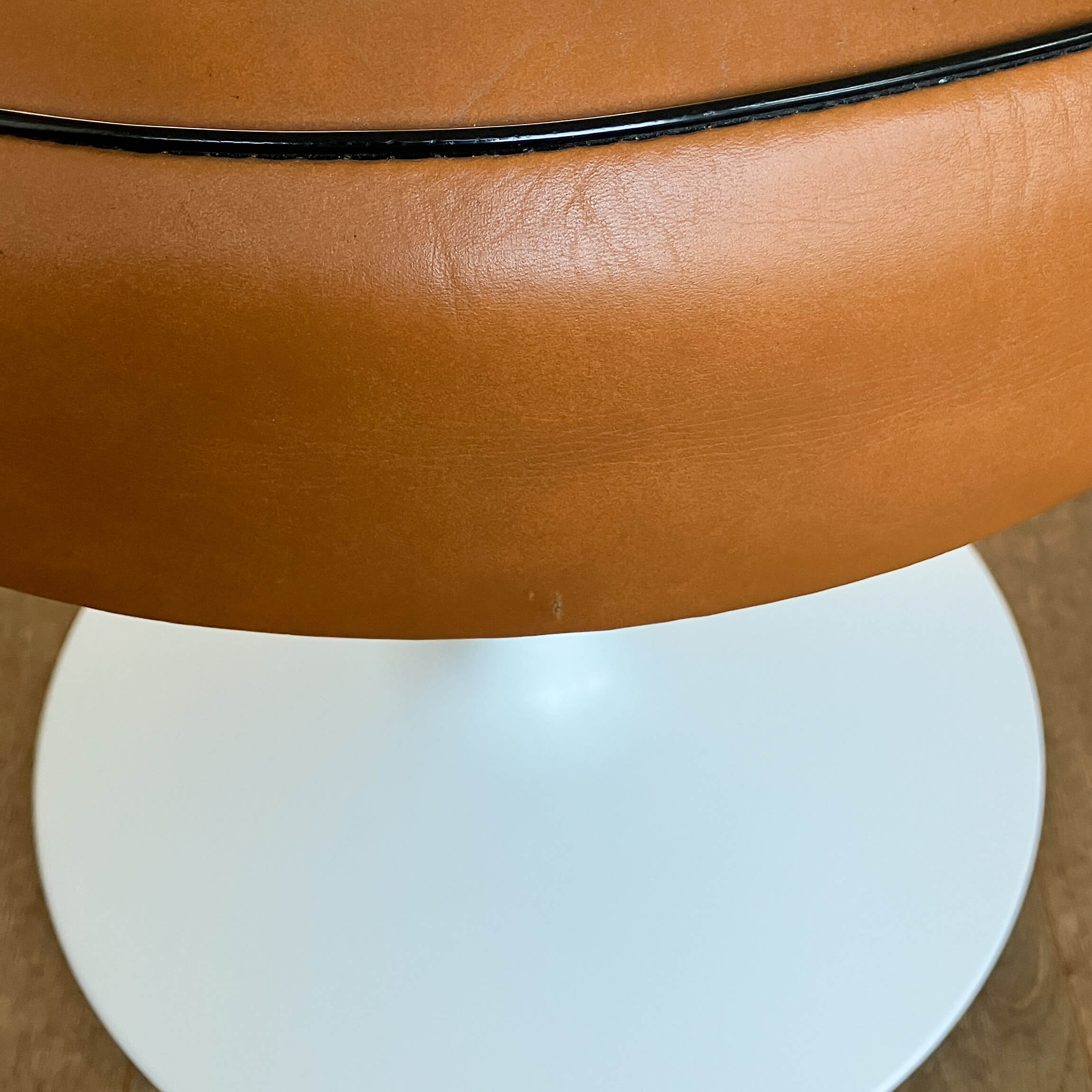 The metal base has been sanded and painted matt white. The brown faux leather seat is in good original condition with two inconspicuous tears on the side (see photos).