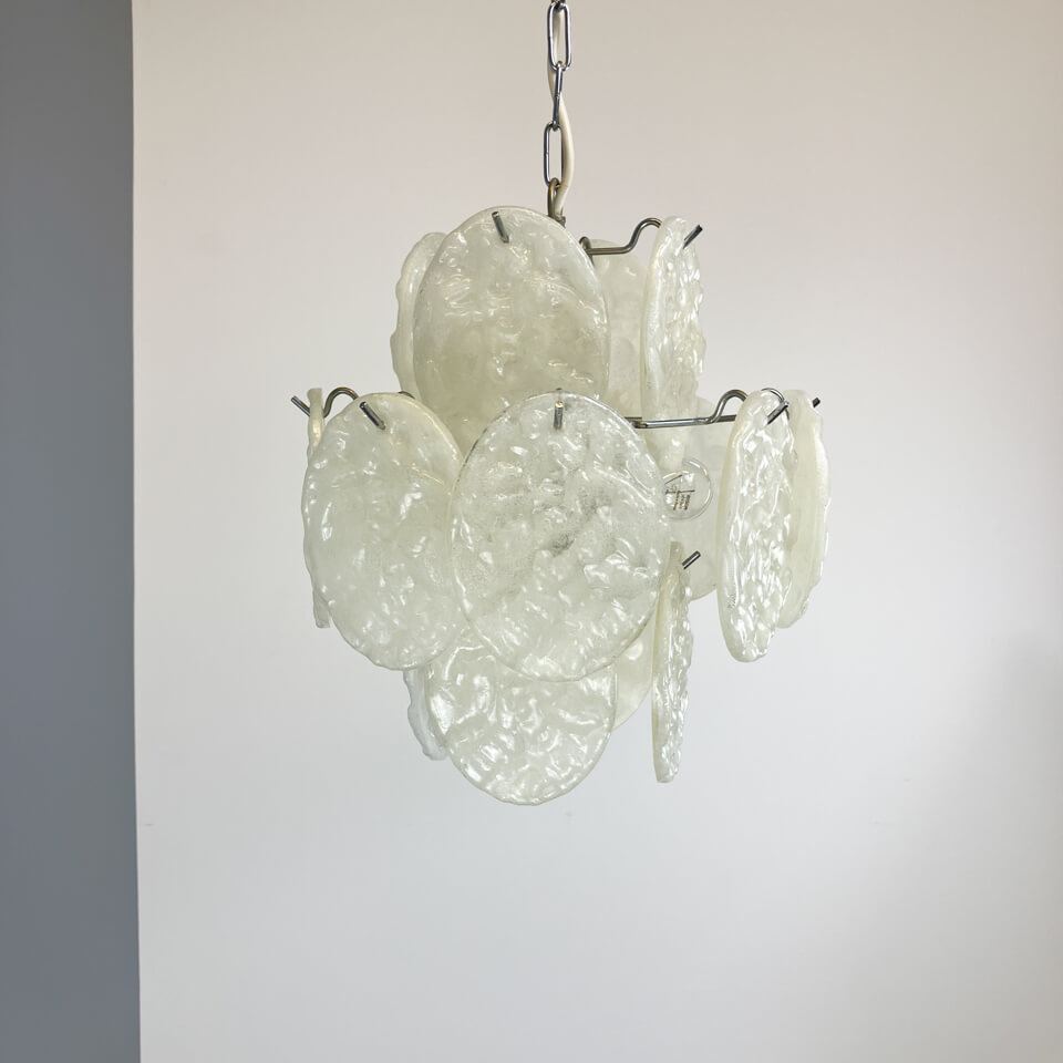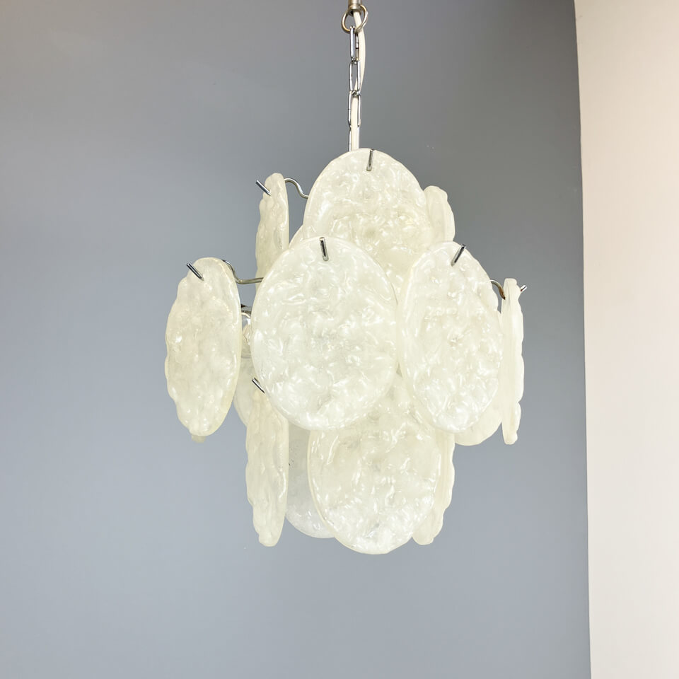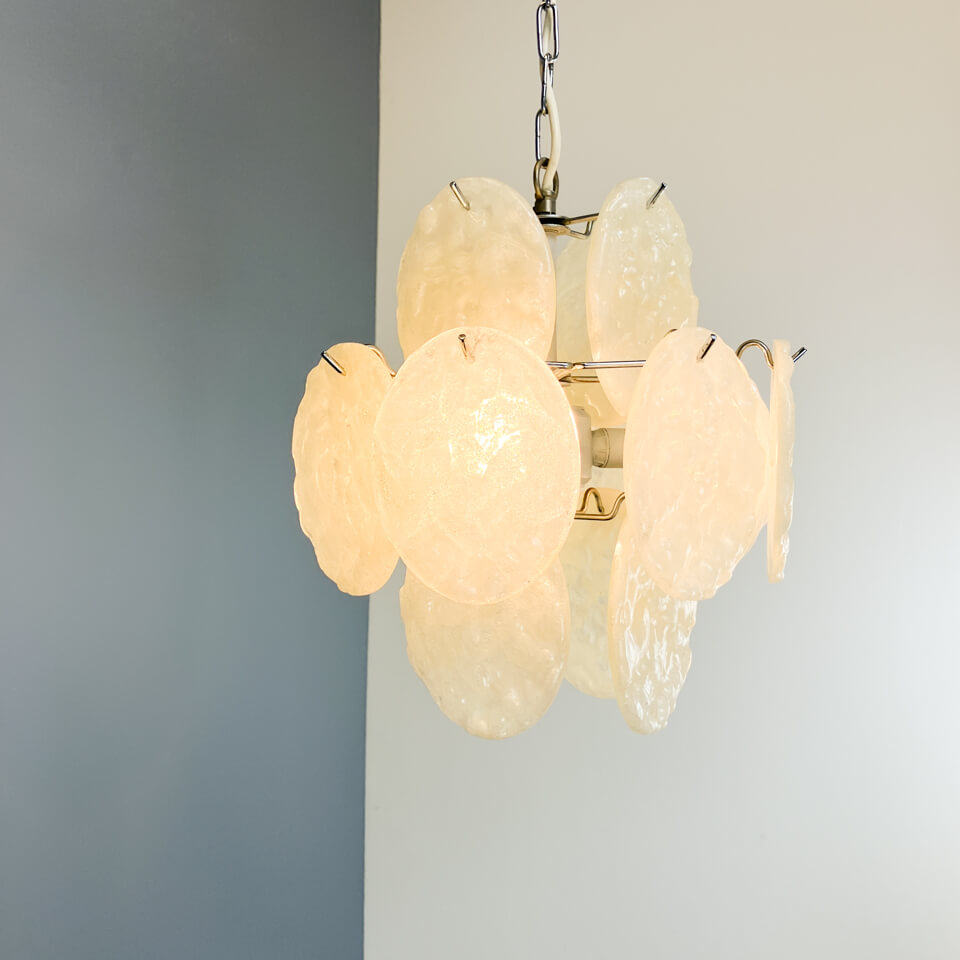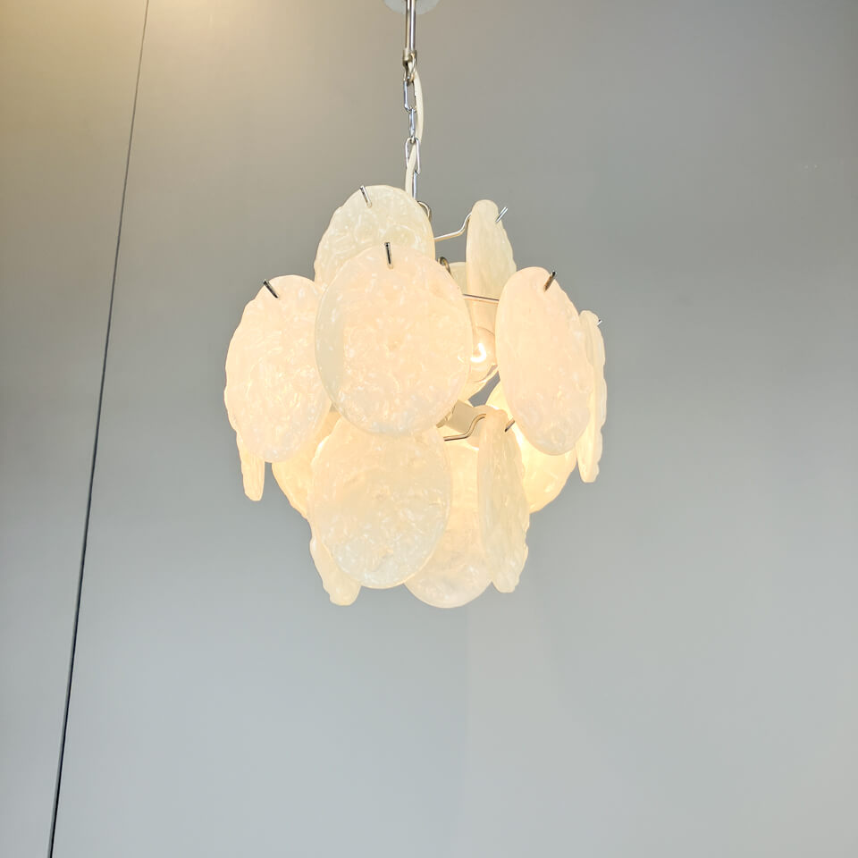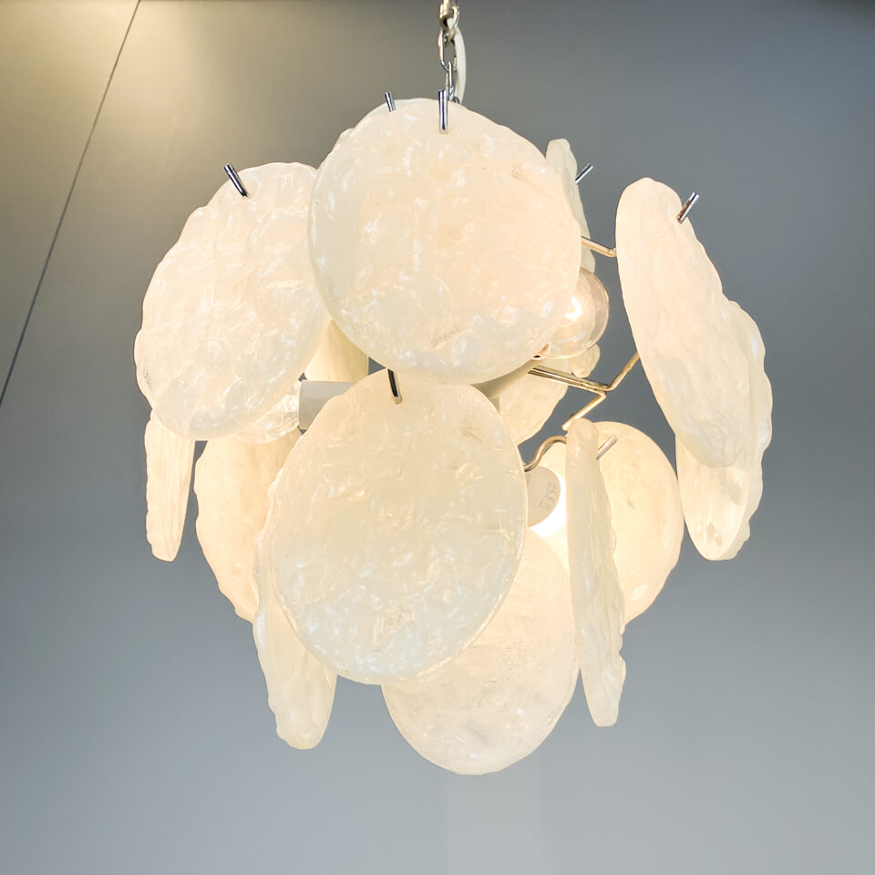 Tolle Deckenleuchte mit Eisglaseffekt. Die 16 Einhängeelemente erzeugen durch ihre strukturierte Oberfläche ein schön gestreutes Licht. Es ist ein weiteres Ersatzelement vorhanden.