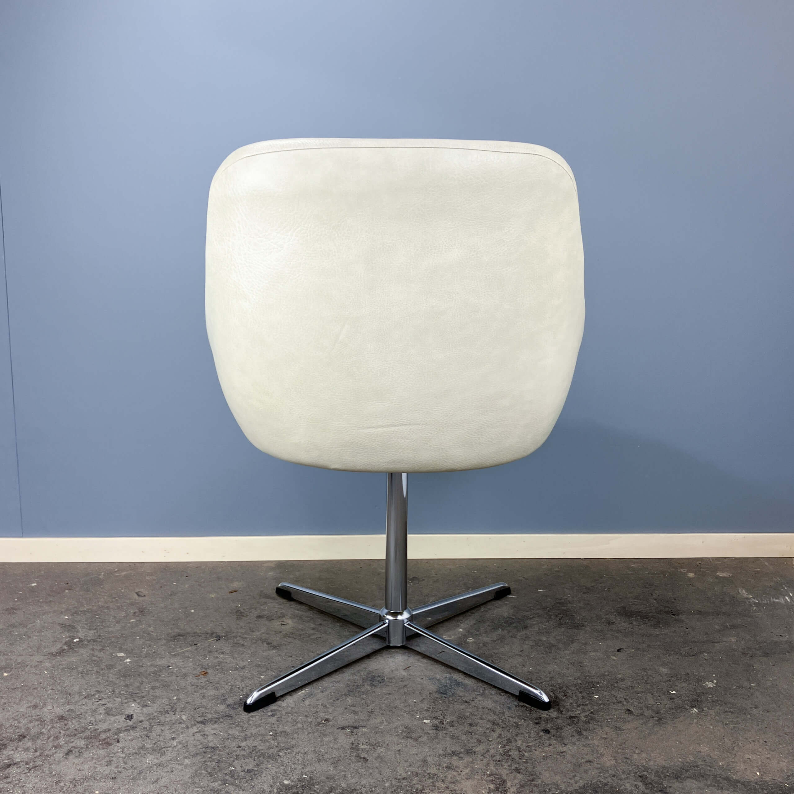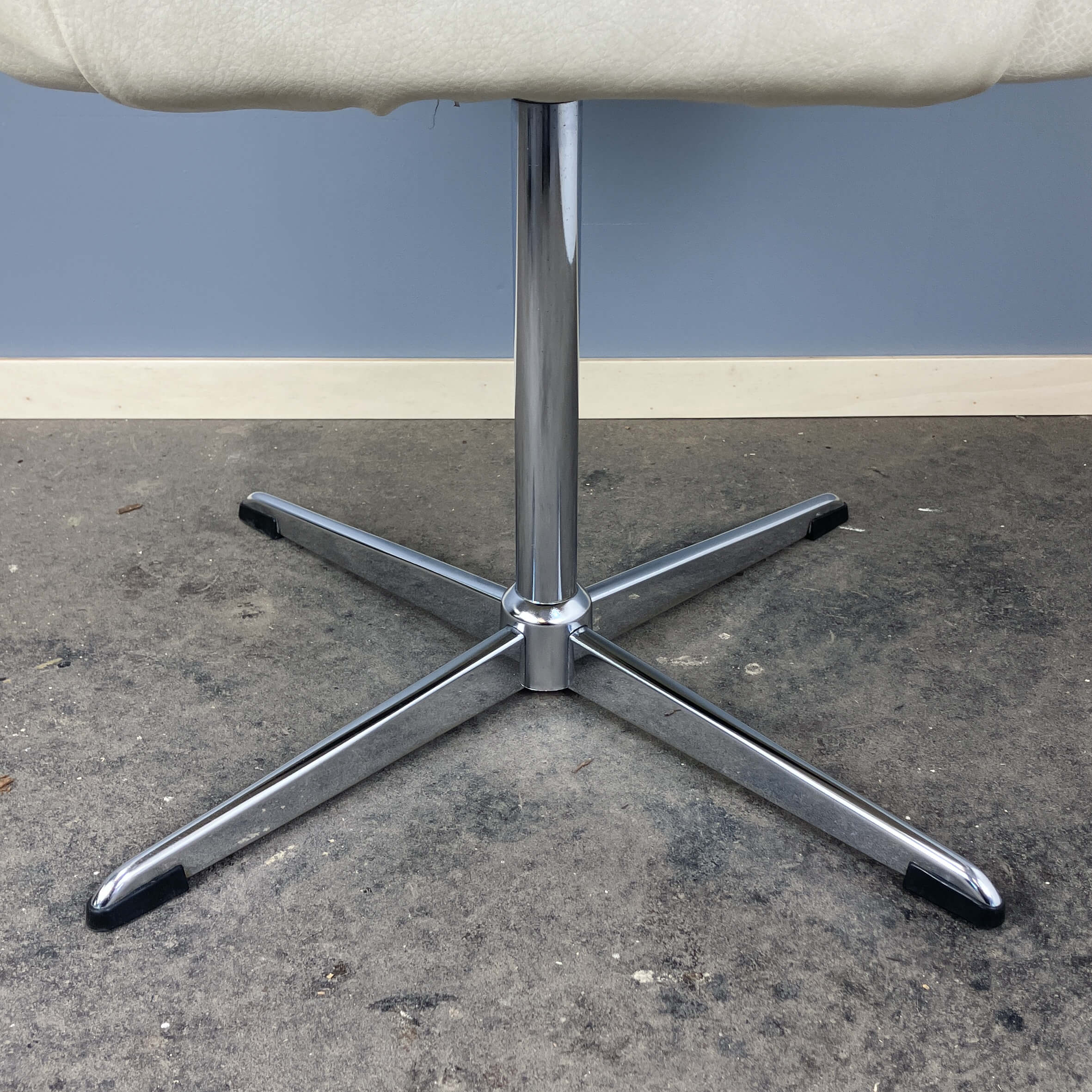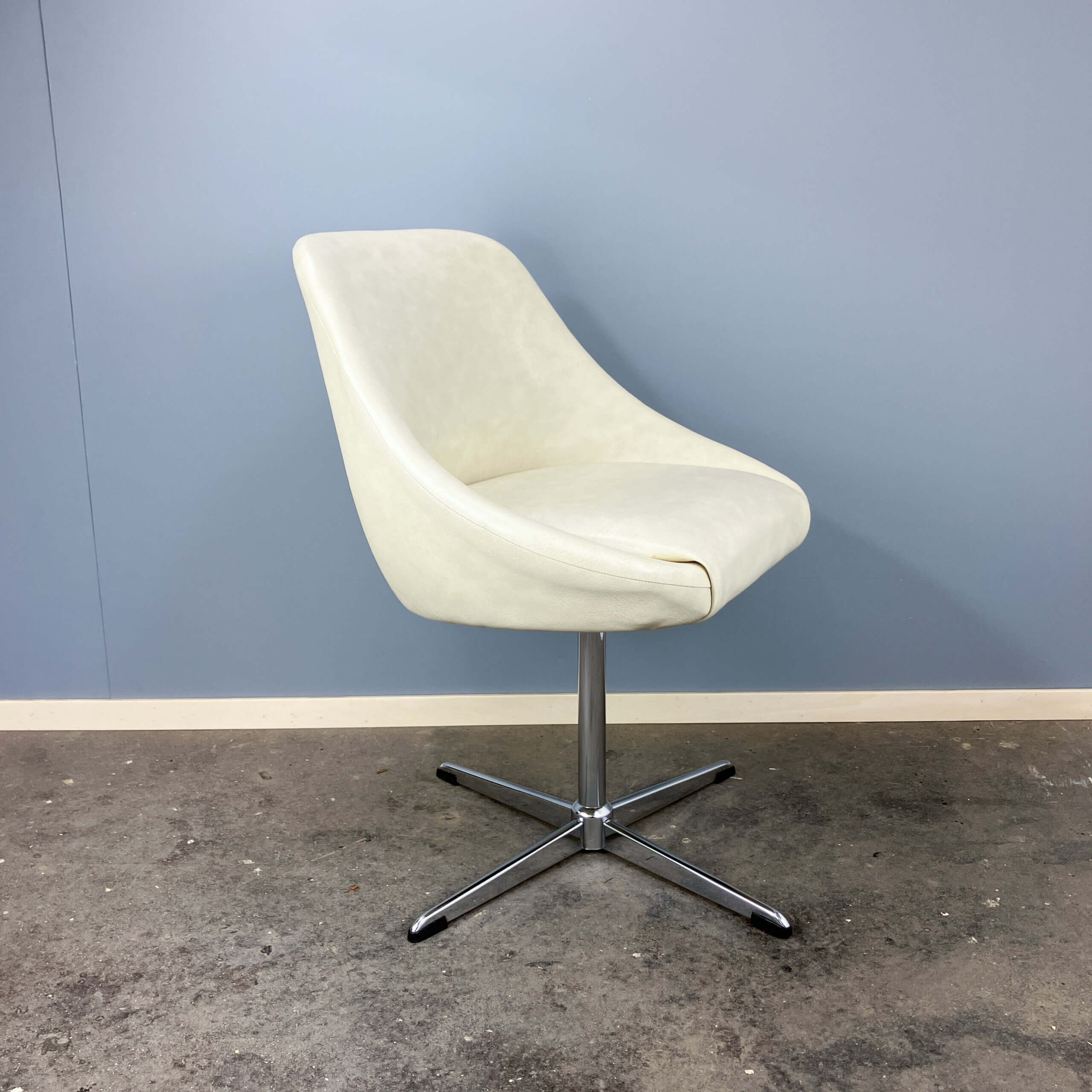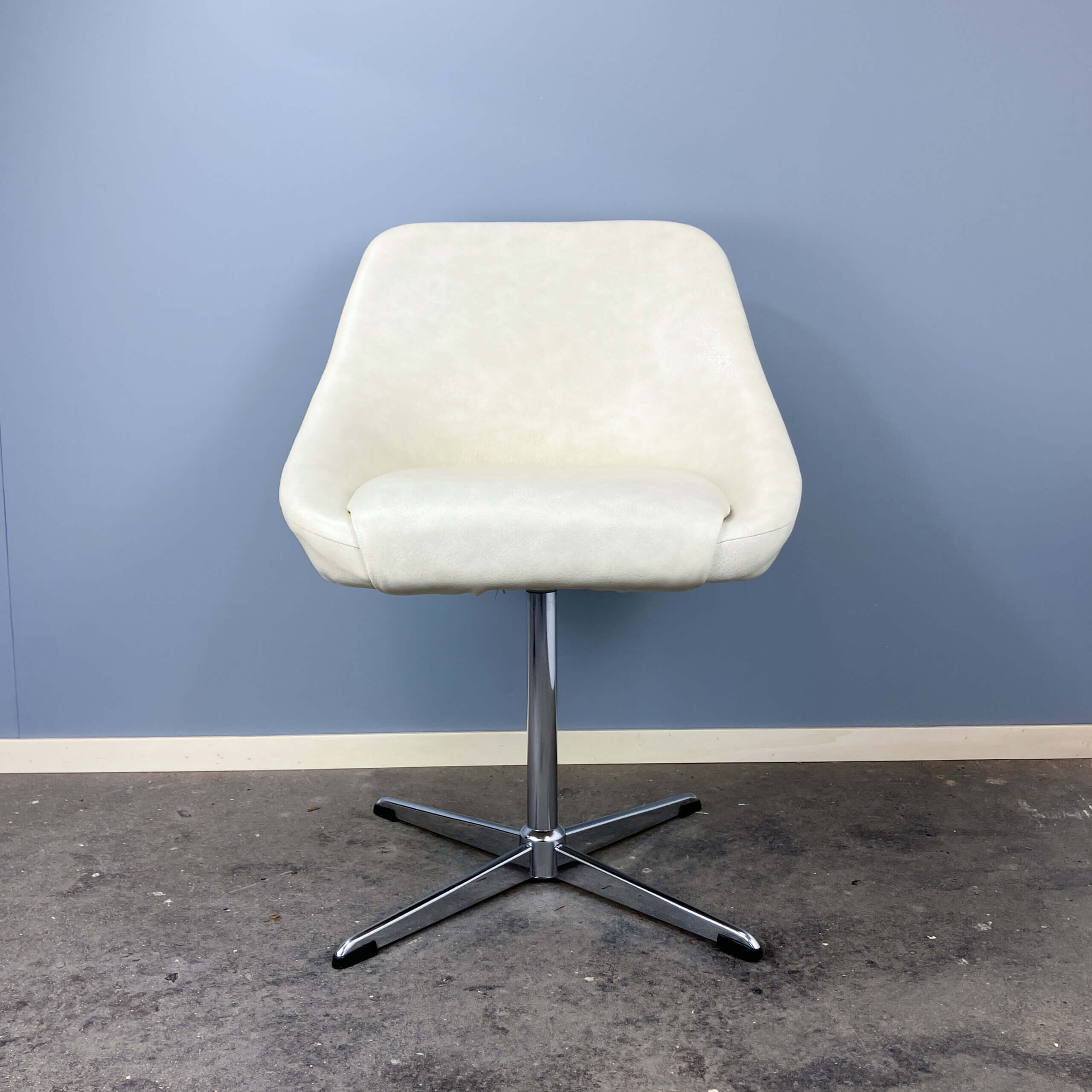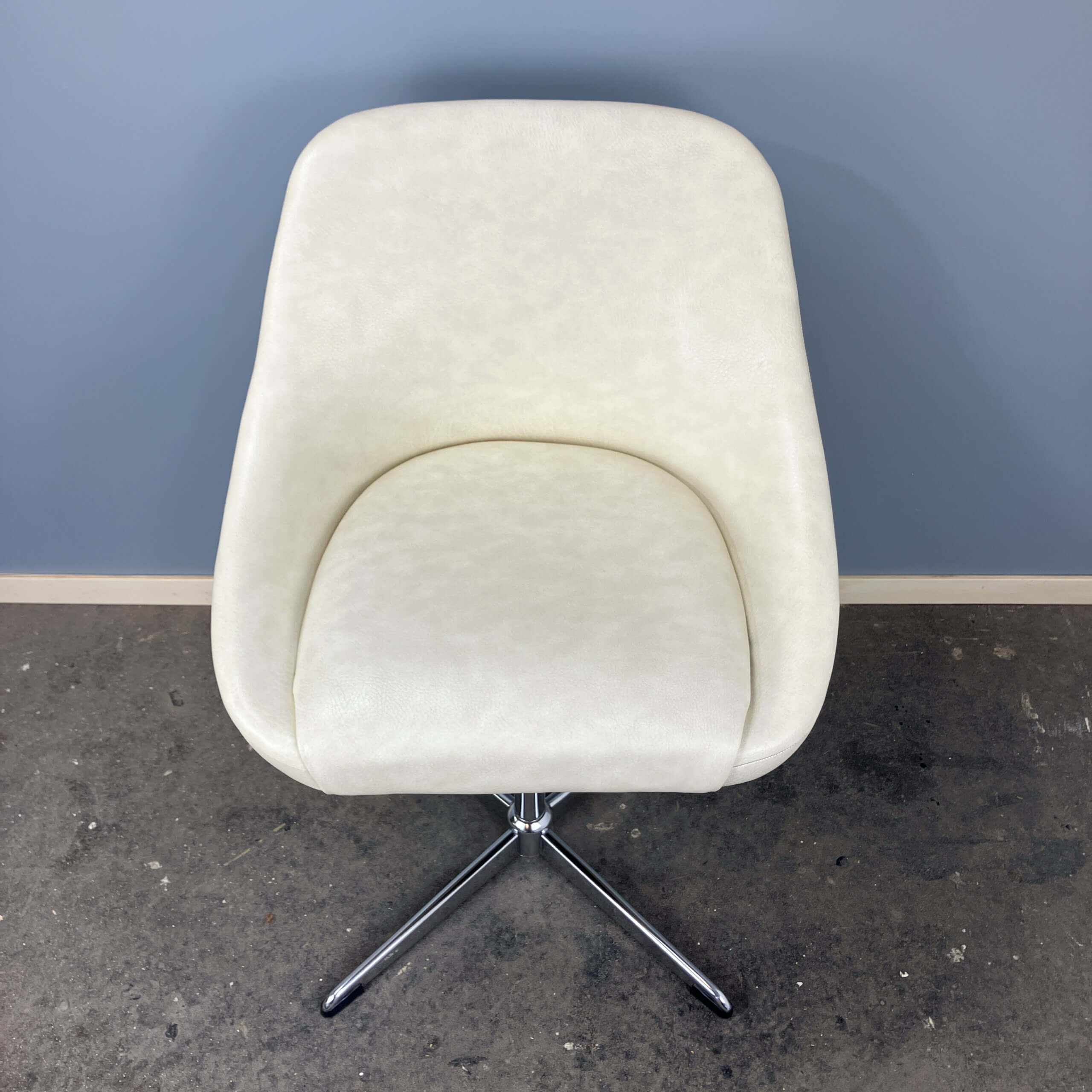 Zierlicher Cocktailsessel im typischen Design des 70er-Lounge-Stil. Das eher matt wirkende, weiß-grau melierte Kunstleder kontrastiert zum glänzenden Chromgestell.