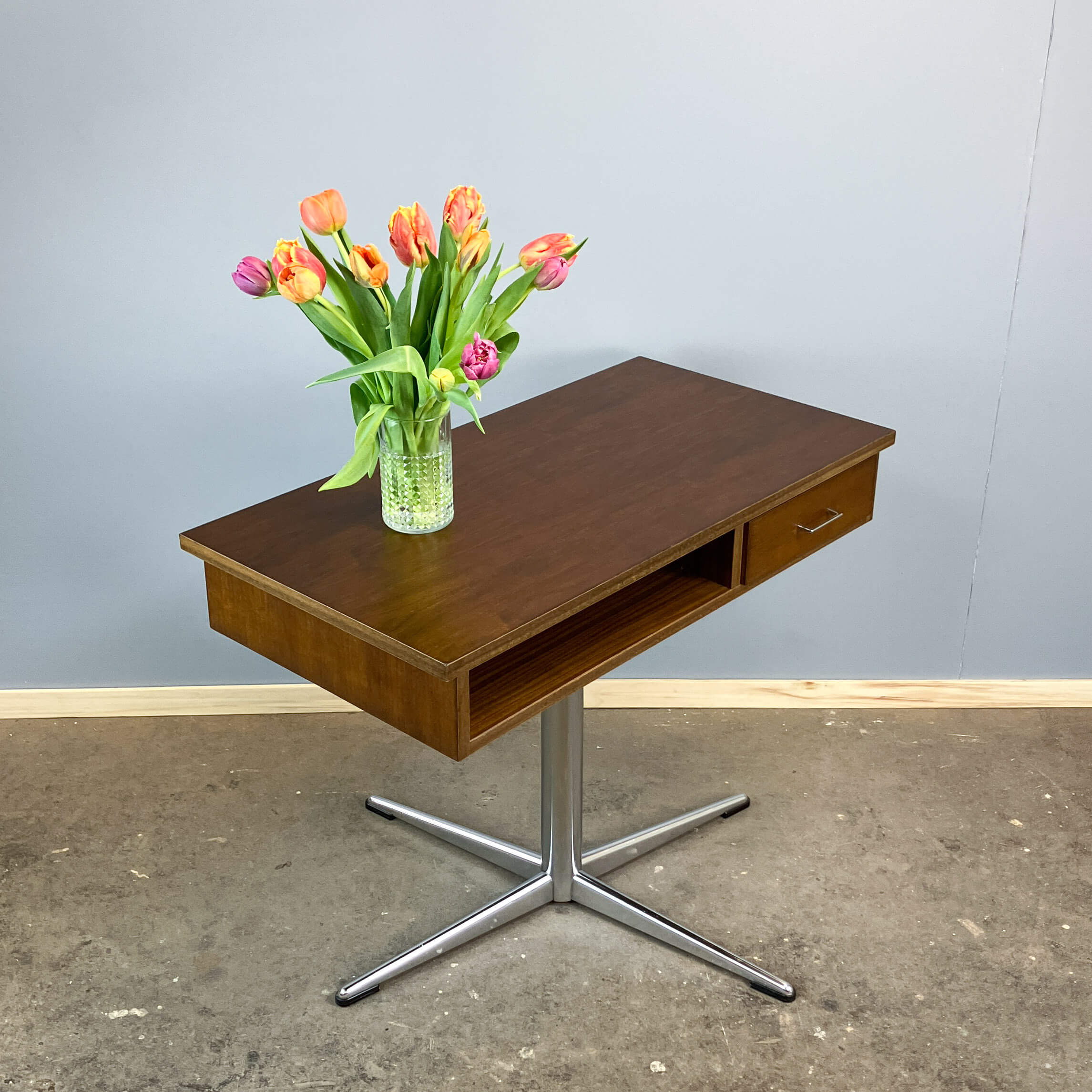 Cooles und praktisches Tischchen mit dem typischen, vierbeinigen Chromfuss der 70er. Die Drehfunktion und das offene Fach prädestinieren es als Fernsehtisch, die schmale Bauform lässt aber auch eine Verwendung als Flurkommode zu.