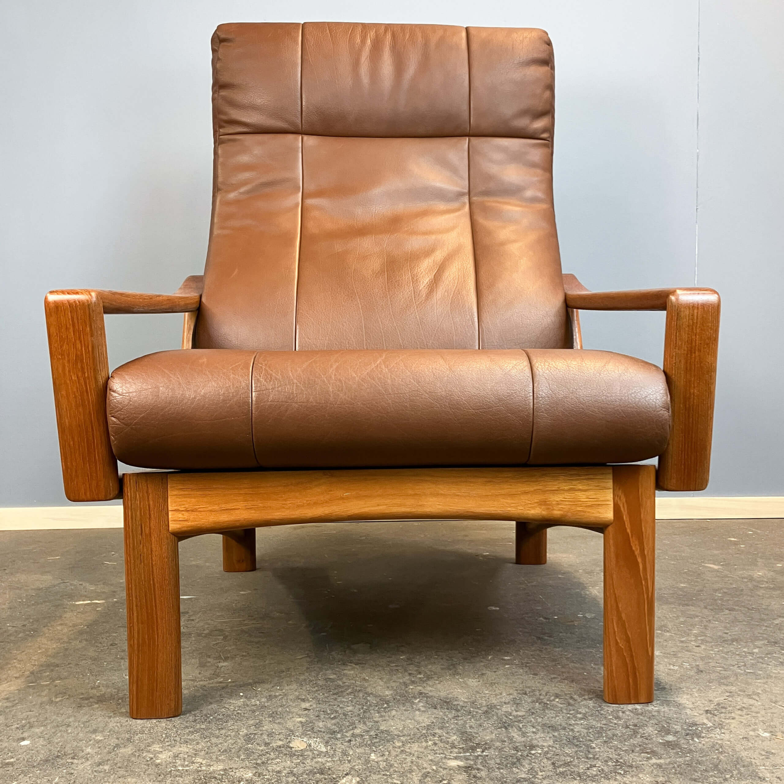 Das Gestell wurde aus massivem Teakholz geferigt, das Sitzpolster ist mit braunem Leder bezogen.