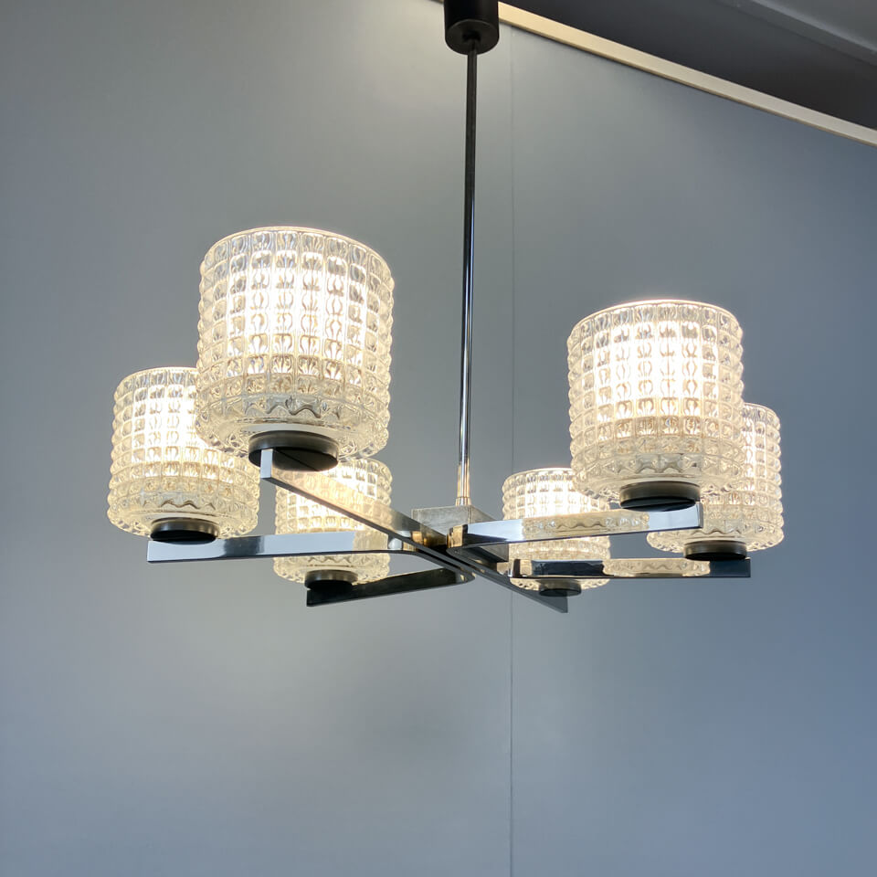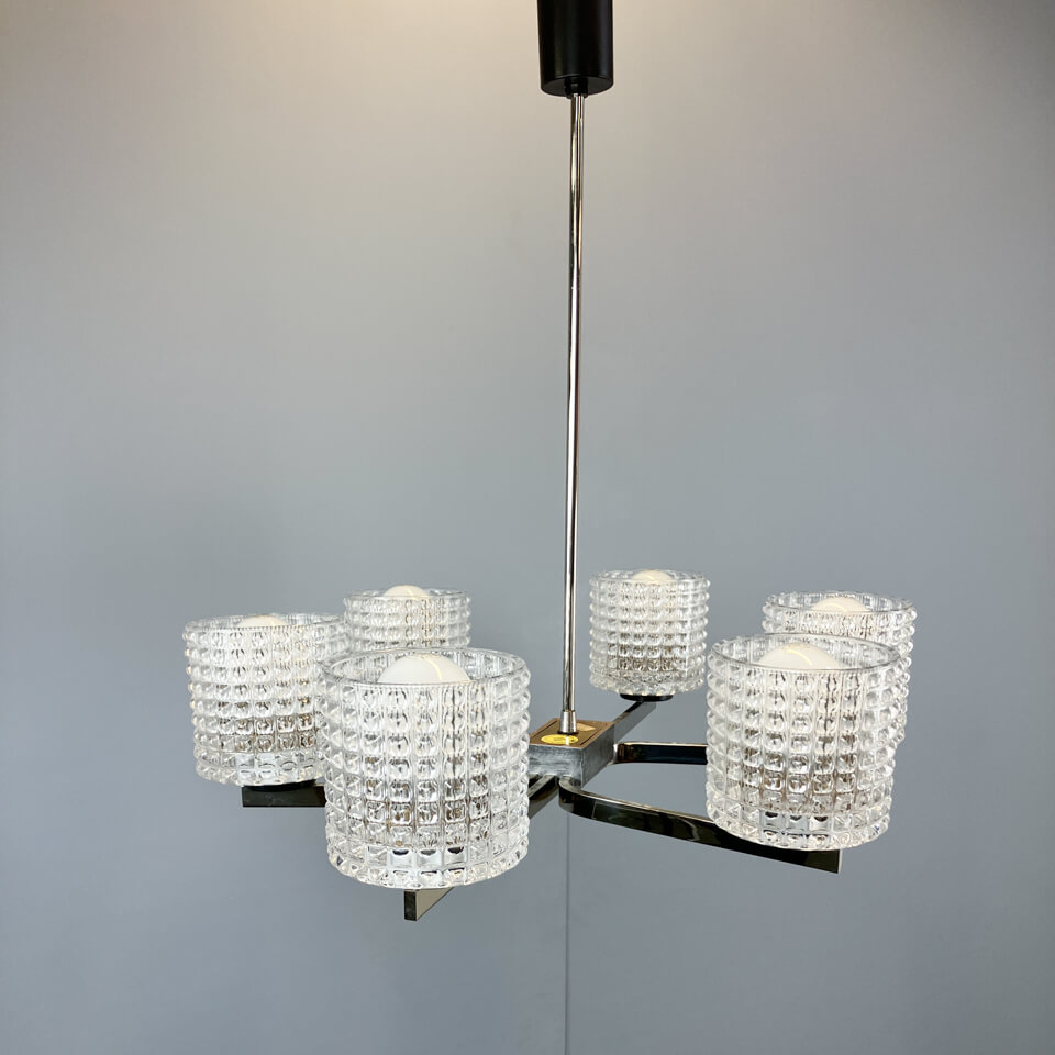 Seltener Vintage Kronleuchter aus deutscher Herstellung in super Erhaltungszustand. Durch die gewellte Oberfläche der Gläser wird das Licht schön gebrochen und die schwarzen Halterungen bilden eine tollen Kontrast zum silbernen Gestänge.