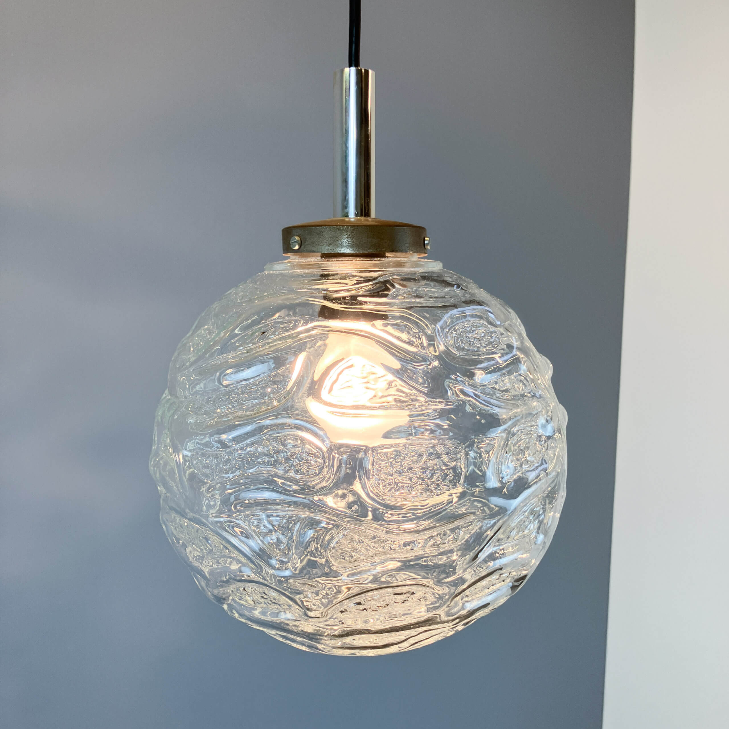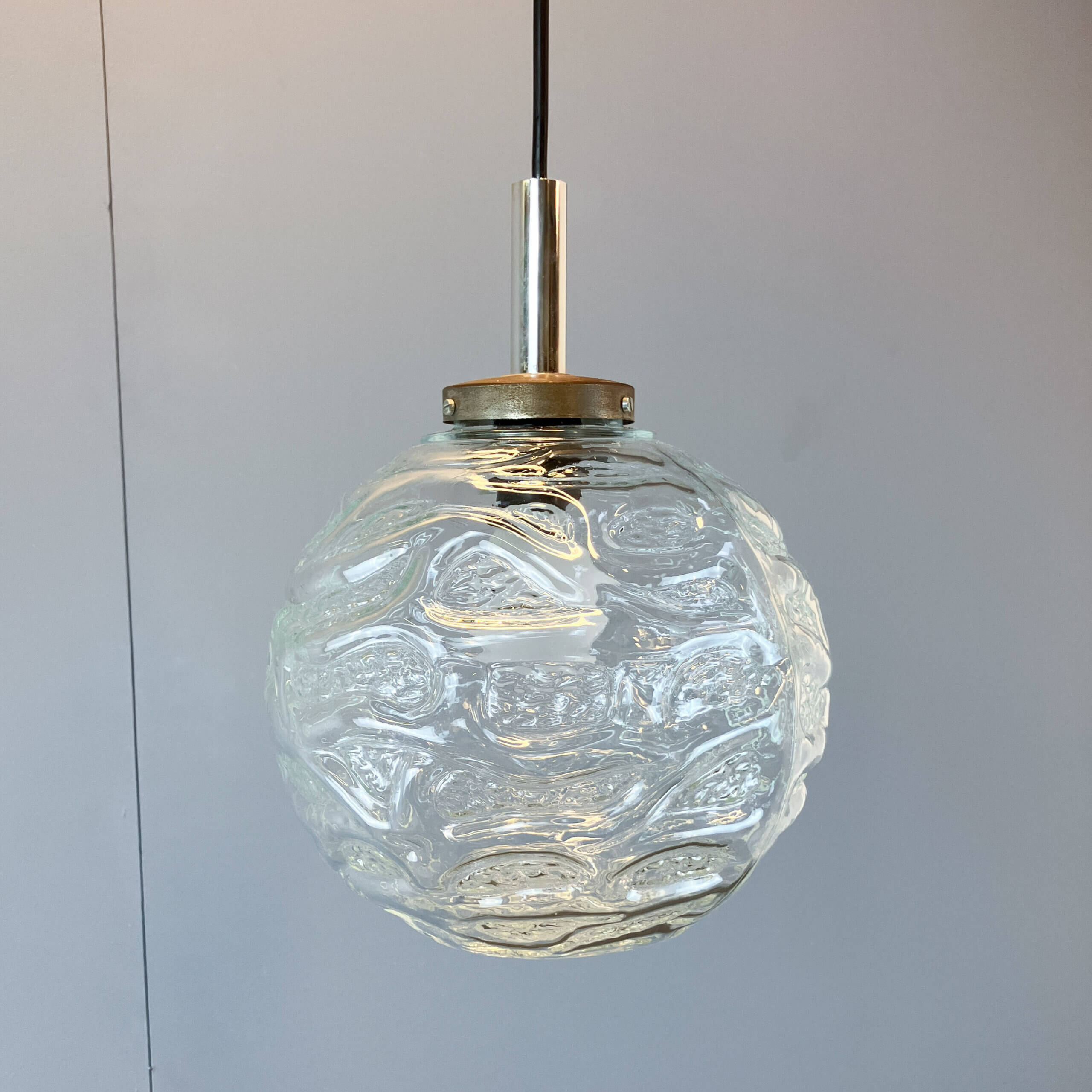 Leuchtenset aus deutscher Herstellung im zeitlosen Mid-Century-Design mit charmantem Vintage-Flair. Die Leuchten glänzen mit strukturigen Glasschirmen, die das Licht spektakulär brechen und einen coolen Retro-Vibe in jeden Raum bringen.