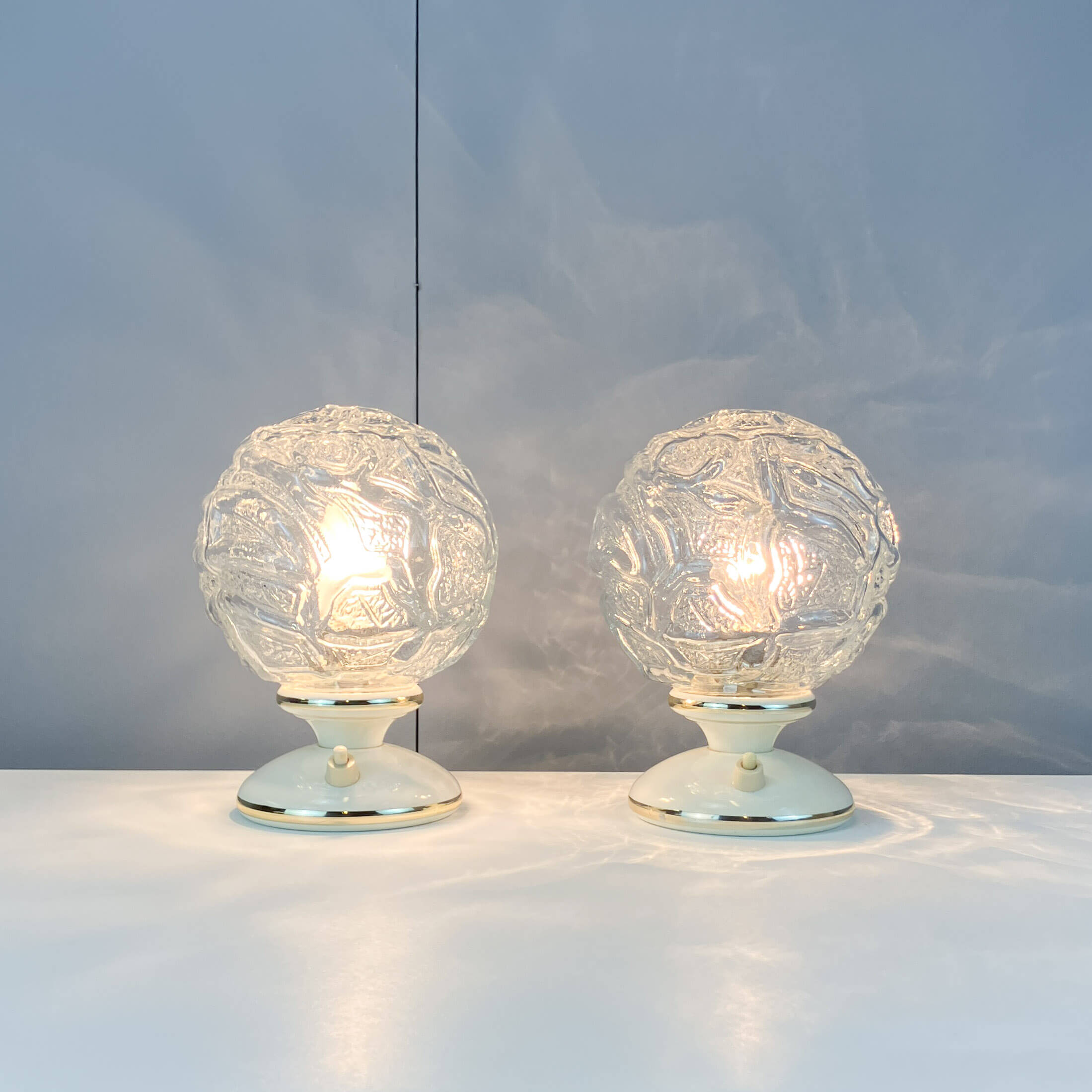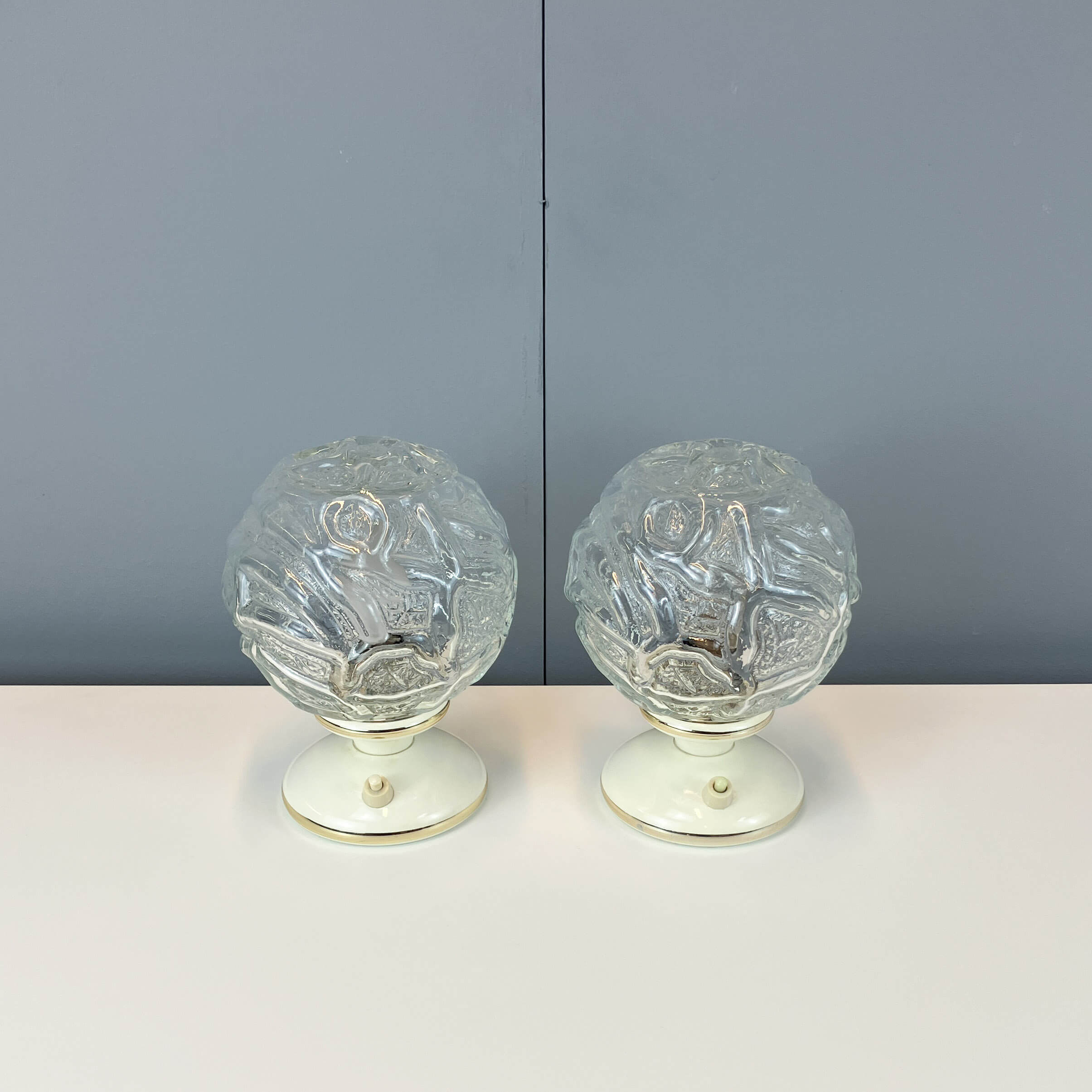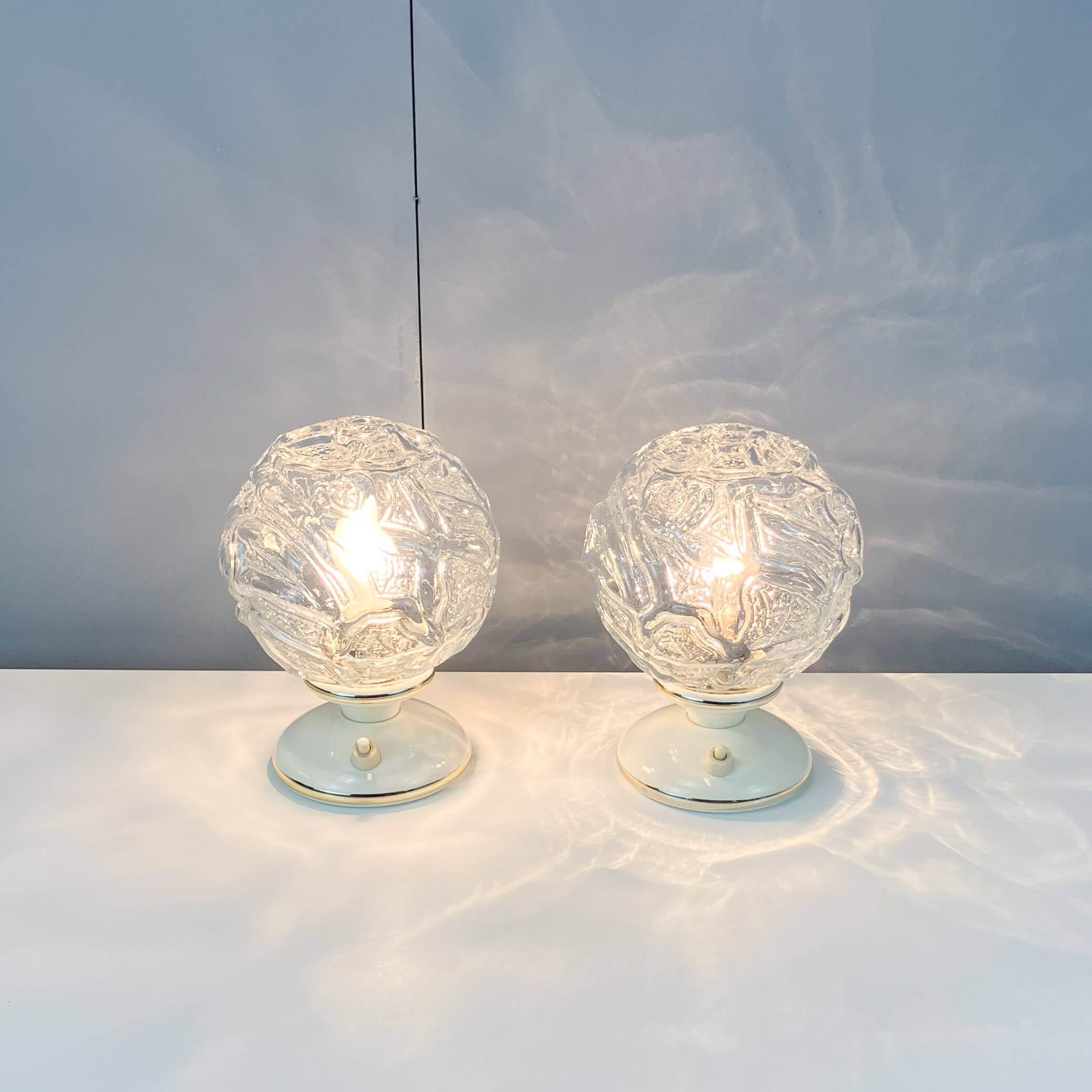 Die Strukturgläser sind vollständig intakt, lediglich an den Kunststoffsockeln der Tischleuchten finden sich rückseitig Risse. Beide Tischleuchten wurden neu verkabelt.