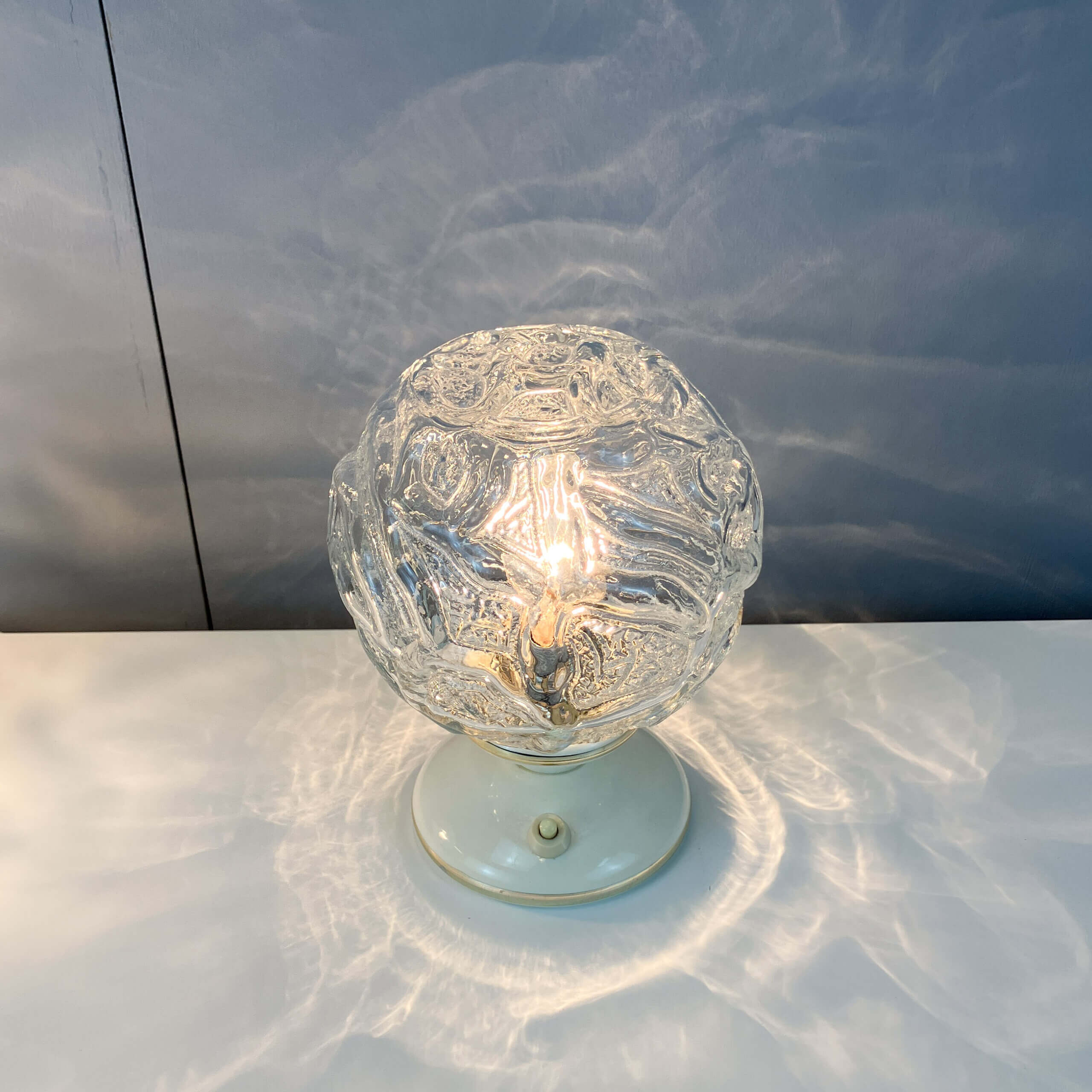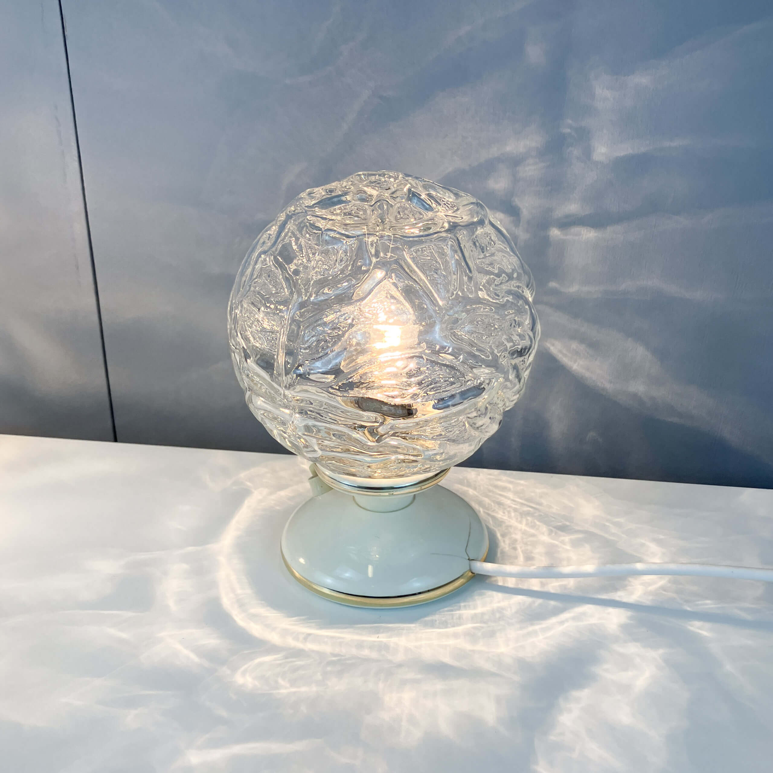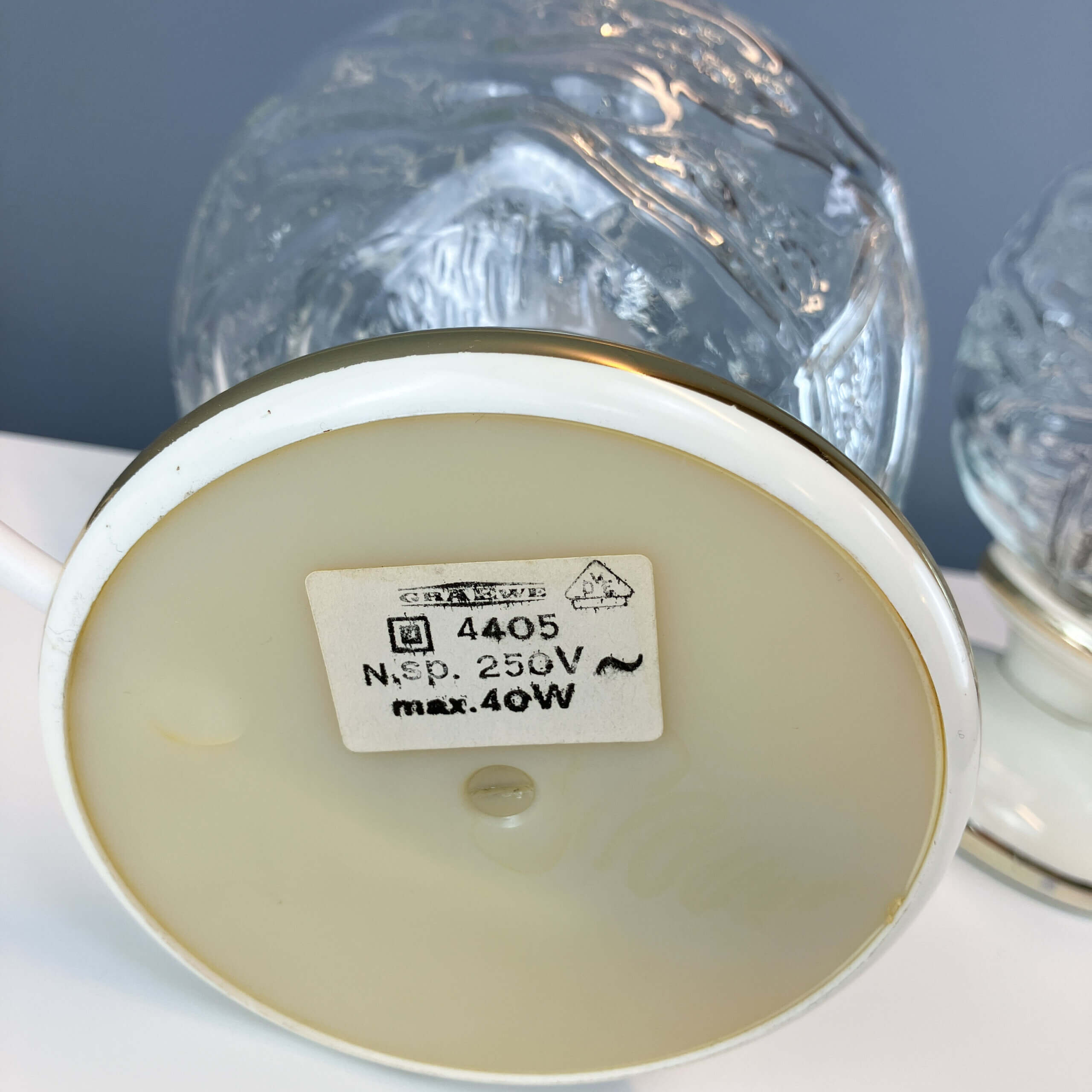 Die Strukturgläser sind vollständig intakt, lediglich an den Kunststoffsockeln der Tischleuchten finden sich rückseitig Risse. Beide Tischleuchten wurden neu verkabelt.